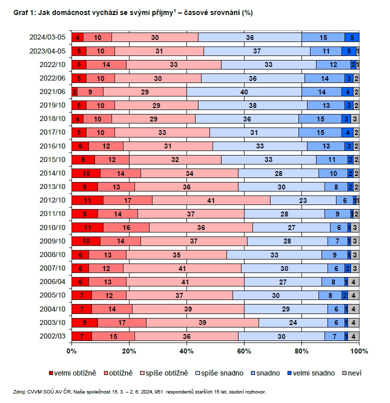 V rámci svého šetření, které CVVM realizovalo v období od poloviny března do začátku června 2024, se zaměřilo na otázku, jak lidé vnímají současnou socioekonomickou situaci svých domácností. Konkrétně se dotázaní vyjadřovali k tomu, zda je pro ně obtížné vyjít s příjmy, zda se jejich domácnost v posledním roce ocitla v obtížné finanční situaci a zda svoji domácnost považují za bohatou či naopak chudou. Dále se pak šetření podrobněji věnovalo tomu, na které potřeby mají domácnosti ve svém rozpočtu dostatek peněz a na které nikoli.