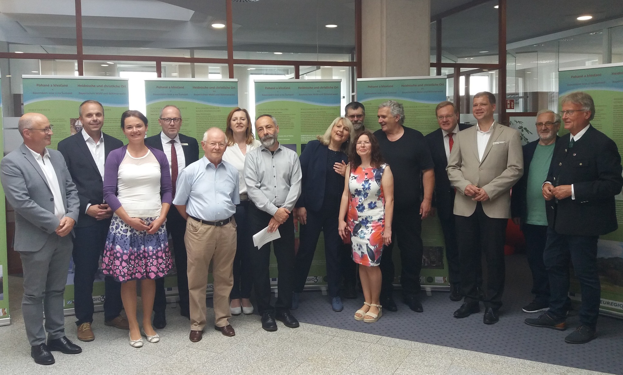 Na Facebooku je plakát s titulem Křesťané a pohané, na fotce z Freyungu plakát s titulem Pohané a křesťané. Nepatrná chybička se vloudila. Nevadí, hlavně, že nálada byla veselá, jak je patrno třeba z pózy paní starostky. A tak to má být. Zvesela jde všechno líp.