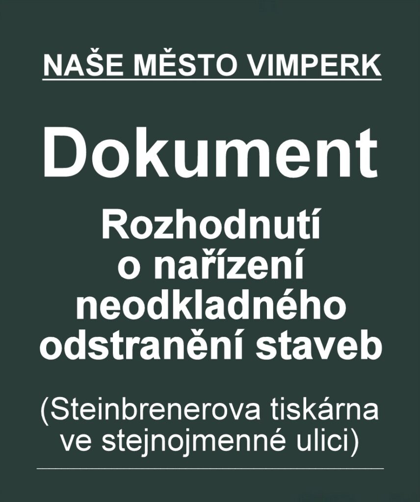 NAŠE MĚSTO VIMPERK – DOKUMENT: Rozhodnutí o nařízení neodkladného odstranění staveb (Steinbrenerova tiskárna)