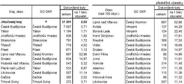 Tab. 2 Obce s nejvyšším počtem dokončených bytů v rodinných a bytových domech v Jihočeském kraji v roce 2023