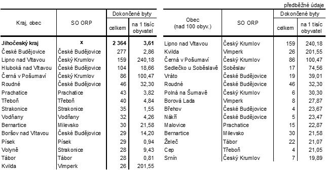 V celém kraji bylo v letech 2019 až 2023 dokončeno 3,10 bytu na 1 tisíc obyvatel. Nejvyšší intenzitu bytové výstavby vykázaly obce v rekreačních oblastech (Lipno nad Vltavou, Kvilda) a obce v bezprostředním okolí velkých měst, ať už na Českobudějovicku (Vráto, Roudné, Hlincová Hora) nebo Jindřichohradecku (Horní Skrýchov, Hatín).