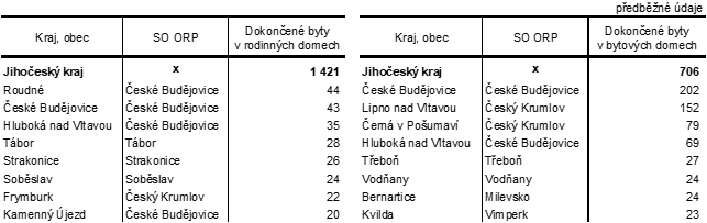V Jihočeském kraji bylo od roku 2019 dokončeno 6 438 bytů v rodinných domech, nejvíce jich uvedlo město České Budějovice (325). Více než 50 bytů tohoto typu bylo v posledních pěti letech zkolaudováno ve 24 obcích a městech, přičemž převahu Českobudějovicka narušila pouze tři okresní města – Tábor, Strakonice a Jindřichův Hradec. Jinak se jednalo převážně o obce v těsné blízkosti krajského města. Do popředí žebříčku se dostala také města Kaplice, Planá nad Lužnicí, a Vimperk. V 94 obcích kraje nebyl ve sledovaném období dokončen žádný byt v rodinném domě.