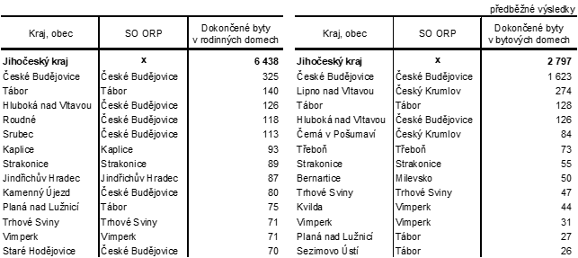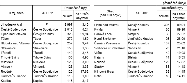 Jen v krajském městě bylo během roku 2023 dokončeno 277 bytů, což činilo necelých 12 % dokončených bytů v celých jižních Čechách. Druhou příčku obsadilo Lipno nad Vltavou se 159 byty a na třetím místě se umístilo město Hluboká nad Vltavou (104 bytů). Ve 43 jihočeských městech a obcích vykázali 10 a více zkolaudovaných bytů a alespoň 1 byt byl dokončen v 368 obcích. Naopak v 256 obcích kraje byla v loňském roce dokončená bytová výstavba nulová. Z tohoto počtu připadalo zhruba 62 % na obce do 200 obyvatel a necelých 29 % obcí spadalo do kategorie od 200 do 499 obyvatel. Žádný byt nebyl dokončen v 9 jihočeských městech a obcích s více než 1 000 obyvateli. K největším se řadila například města Sezimovo Ústí, Bechyně a Lišov.