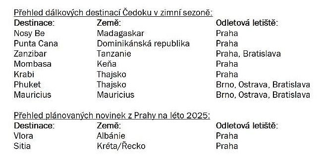 Plány na letní sezonu v roce 2025 nabraly u nejstarší cestovní kanceláře Čedok jasné obrysy, jen pro pražské letiště si Čedok připravil na příští léto přes 40 destinací, z toho dvě novinky. Nově plánuje zájezdy do oblasti Sitia ve východní části řecké Kréty a také na jih Albánie, kde vzniká nové letiště Vlora. Čeští turisté se podívají do všech svých oblíbených letních destinací i na poznávací zájezdy.