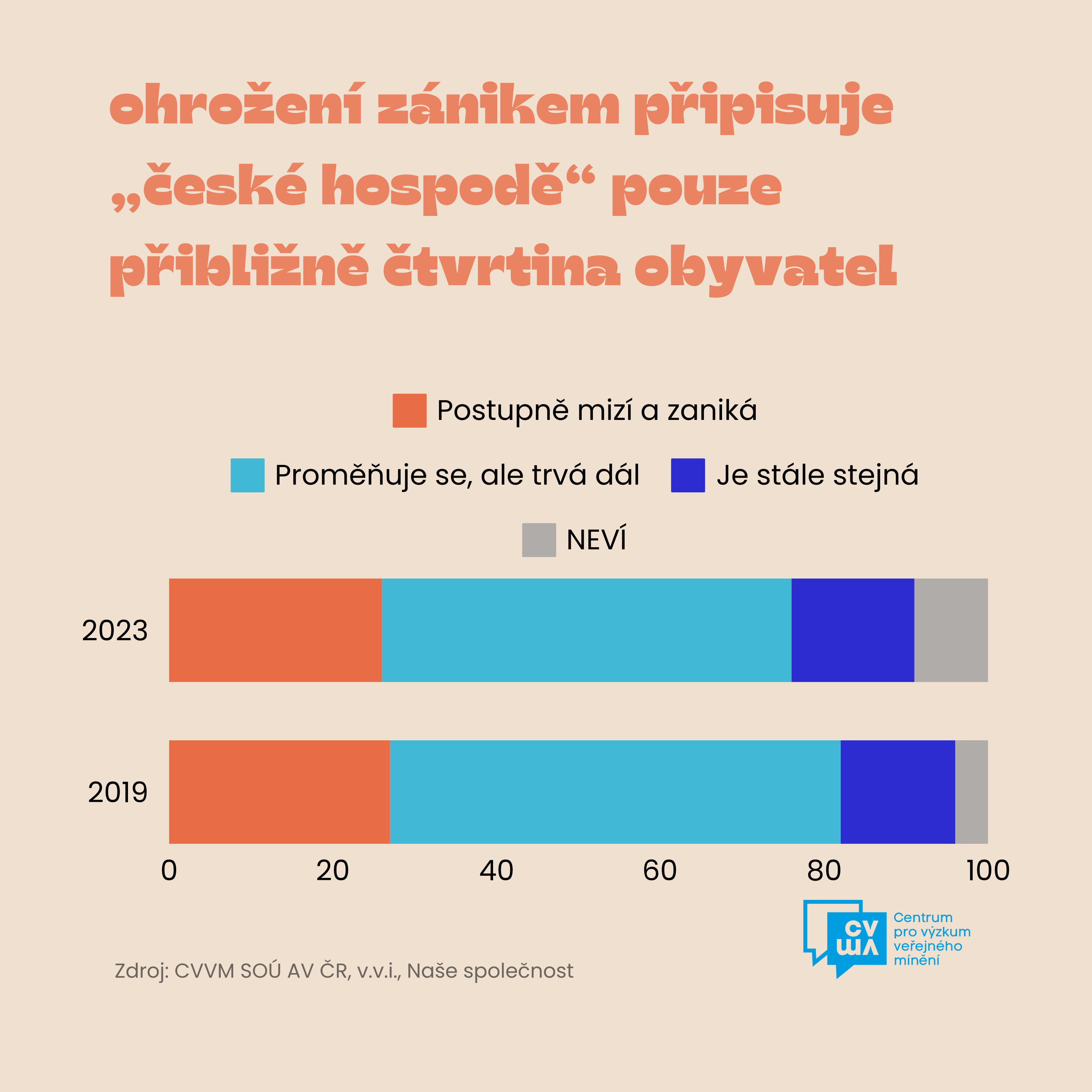 Výzkumný projekt „Pivo a hospody v české společnosti“, realizuje CVVM SOÚ AV ČR nepřetržitě od roku 2004. Zpráva přináší základní výsledky o obrazu české hospody u české veřejnosti, funkcích, které podle ní plní, a hodnocení změn, které prodělává, včetně očekávaného směřování dalšího vývoje. Poslední blok je věnován otázkám na hospody v místě bydliště a na jejich zanikání, resp. vznikání v posledních letech.