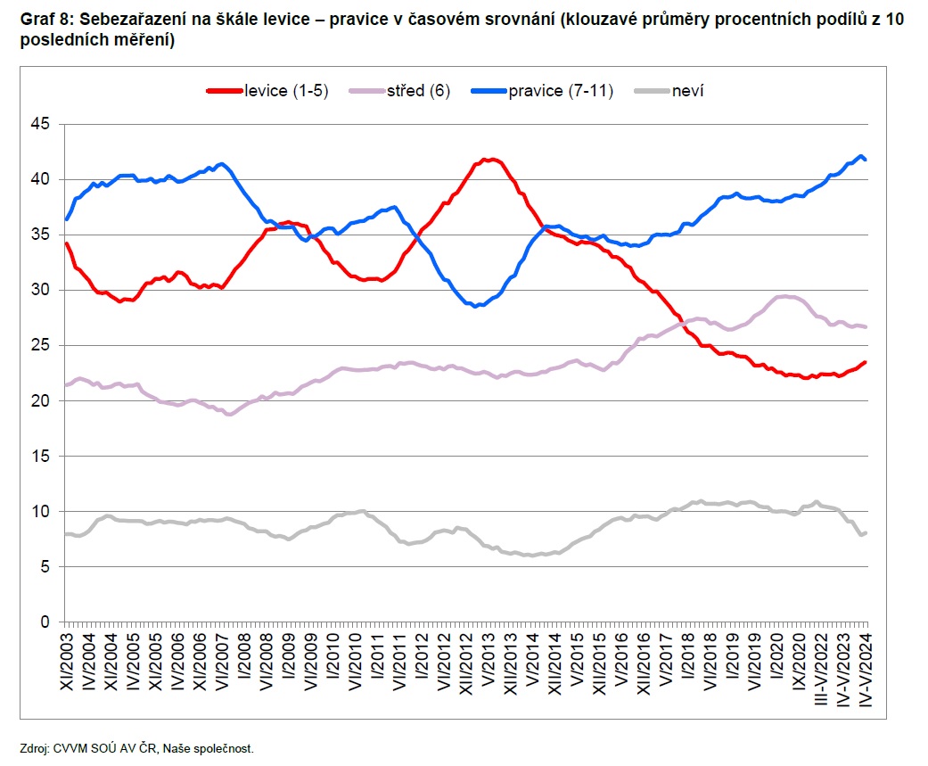 V rámci jarního šetření Centrum pro výzkum veřejného mínění Sociologického ústavu AV ČR, v.v.i., položilo všem respondentům otázku, která na jedenáctibodové škále sleduje levopravou politickou orientaci: „V politice lidé někdy hovoří o pravici a levici. Kam byste se sám zařadil na této stupnici?“ Body 1 až 5 na škále reprezentují levou část spektra, bod 6 představuje střed a body 7 až 11 zastupujícími pravou stranu.