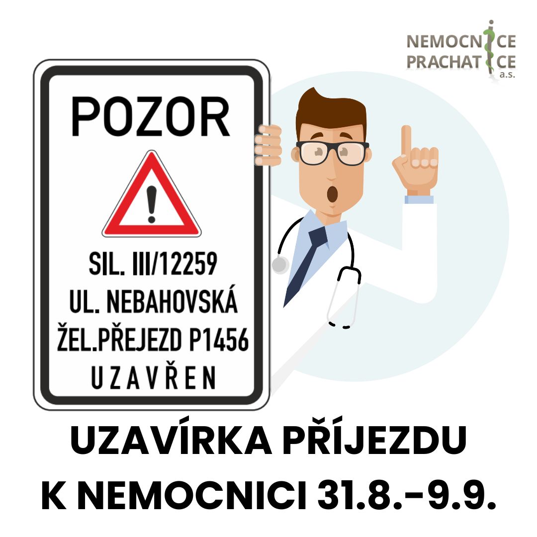 Upozorňujeme pacienty, že od 31. srpna do 9. září 2024 dojde k úplné uzavírce silnice III/12259 v Prachaticích, konkrétně v úseku železničního přejezdu k nemocnici (ulice Nebahovská). Důvodem uzavírky jsou opravy železničního přejezdu.