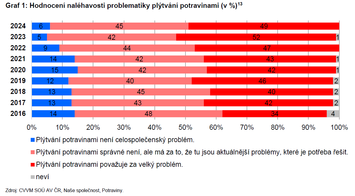 Téměř polovina české veřejnosti (49 %) považuje plýtvání potravinami za velký problém, podle dalších více než dvou pětin (45 %) plýtvání potravinami správné není, ale jsou tu aktuálnější problémy, které je potřeba řešit, a pouze 6 % českých občanů nepovažuje plýtvání potravinami za celospolečenský problém.