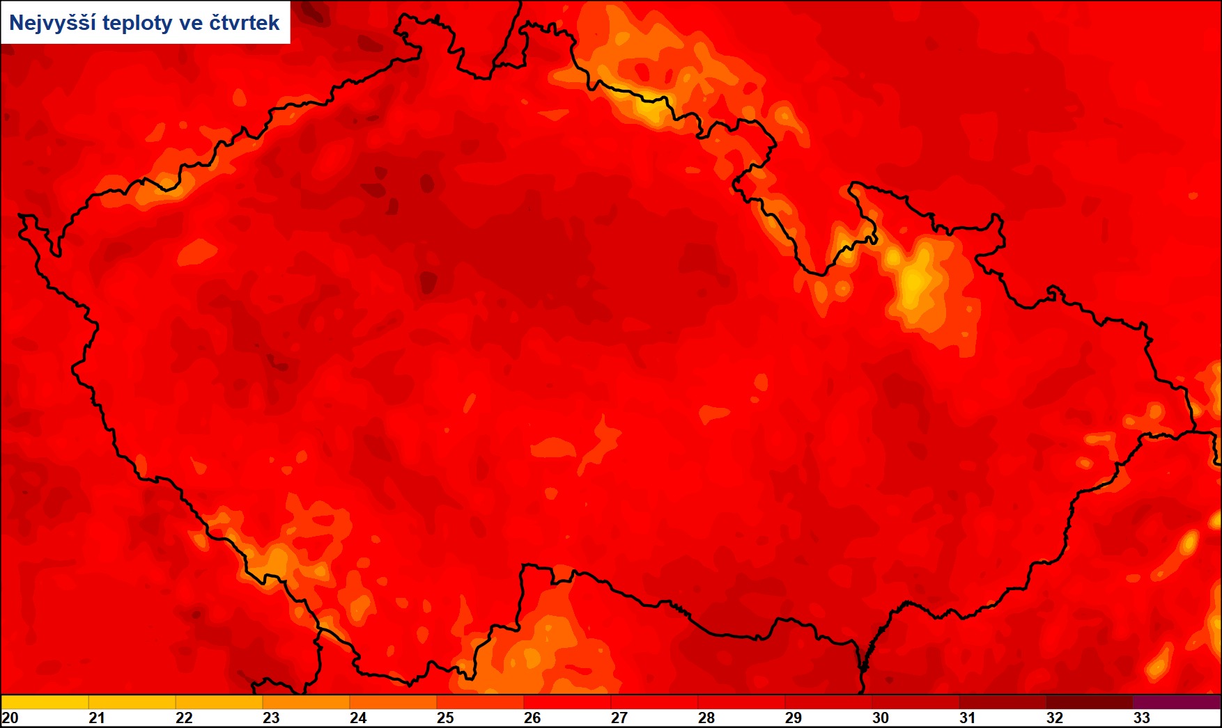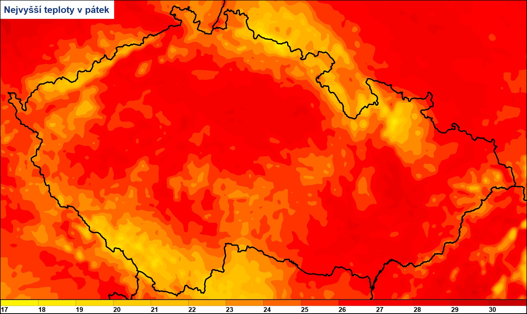 Po dvou extrémně teplých dnech, kdy se posouvaly teplotní rekordy na většině stanic, bude dnešní den asi o 2 °C chladnější. Teplota přesto vystoupí na 28 až 32 °C.