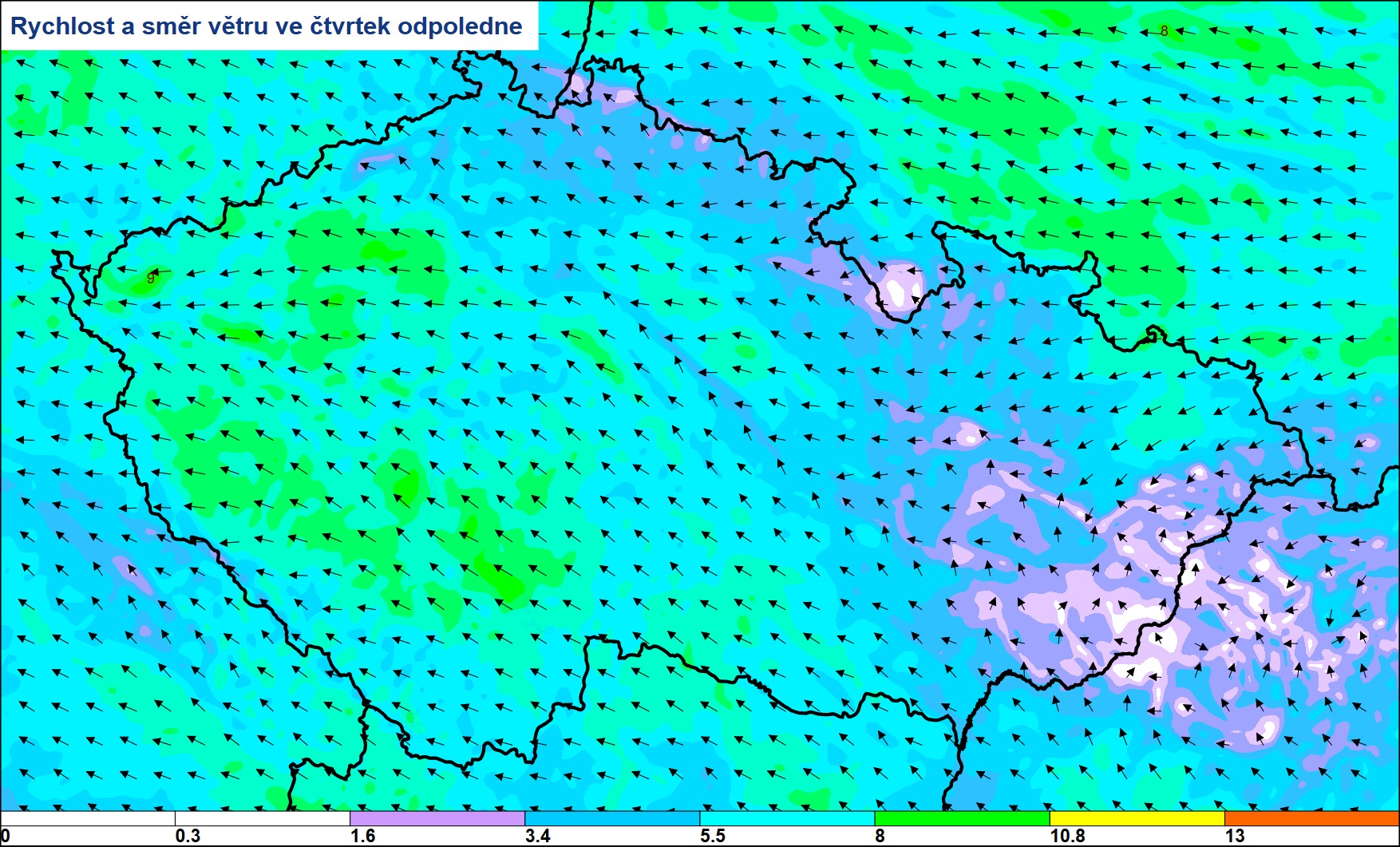 Přeháněk či bouřek bude dnes na našem území jen minimálně. Oproti včerejšímu dni se rozfouká jihovýchodní vítr, nejvíce bude foukat v jihozápadní půlce Čech, naopak nejslabší očekáváme na východě Moravy.