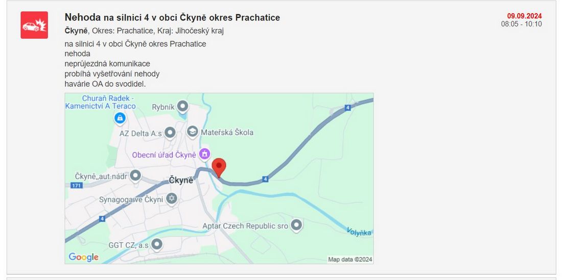 AKTUÁLNĚ: Dopravní nehoda u Čkyně, silnice je neprůjezdná