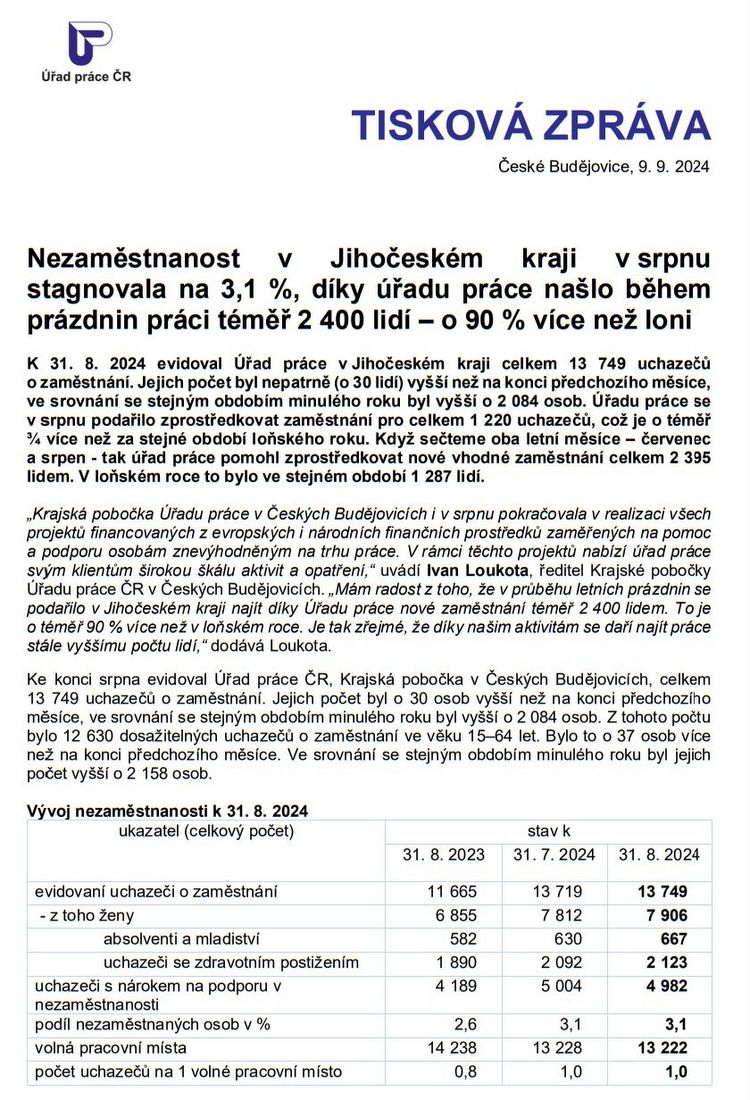 Z PRVNÍ RUKY: Nezaměstnanost v Jihočeském kraji v srpnu 2024