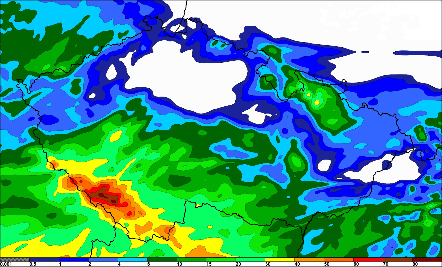 Dnes se těžiště srážek přesune na jih a jihozápad území, zejména na Šumavu a do Novohradských hor, kde by mohlo lokálně za dnešek napršet 50 až 70 mm, včetně zítřka až kolem 80 mm srážek (to platí pro Šumavu). Zítřkem by zároveň měla tato výrazná srážková epizoda končit.