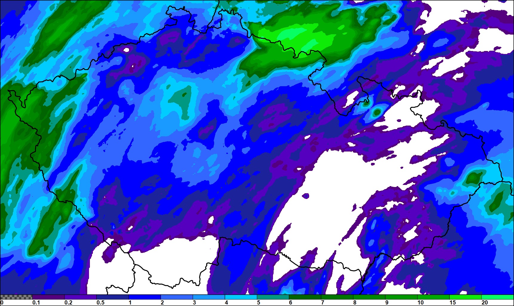 Druhá mapka ukazuje kolik by dle modelu Aladin ještě mohlo napršet za zbytek dneška a zítřek.