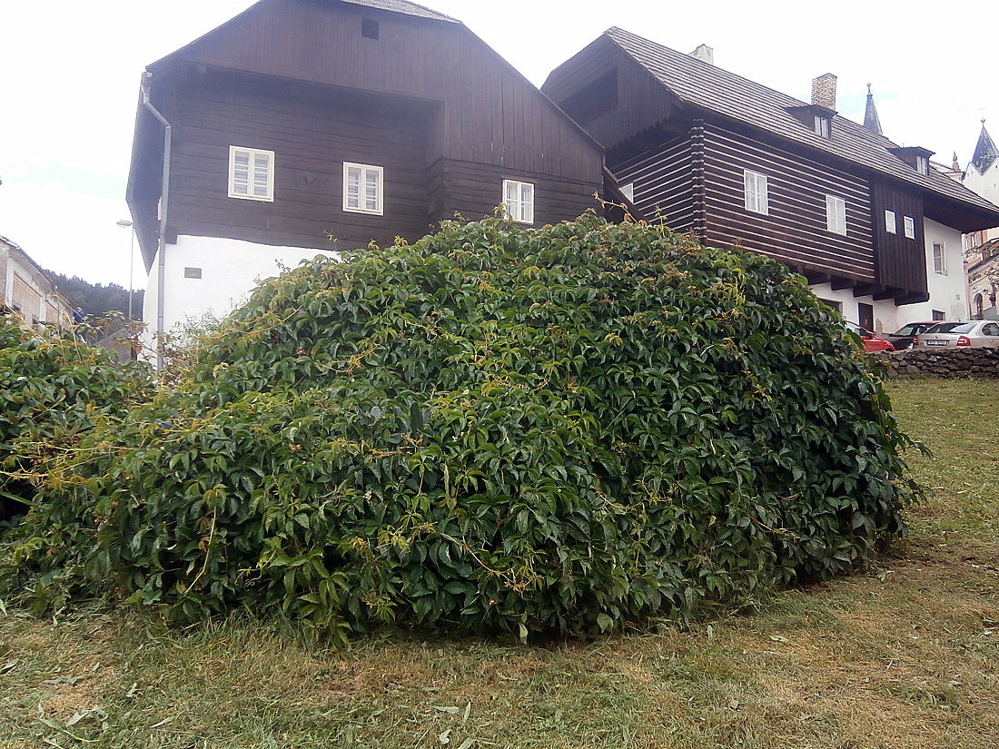 Péče o veřejnou zeleň v historickém centru “Zdravého” města v praxi: Pod planě rostoucím “psím vínem” skomírá keř rododendronu.