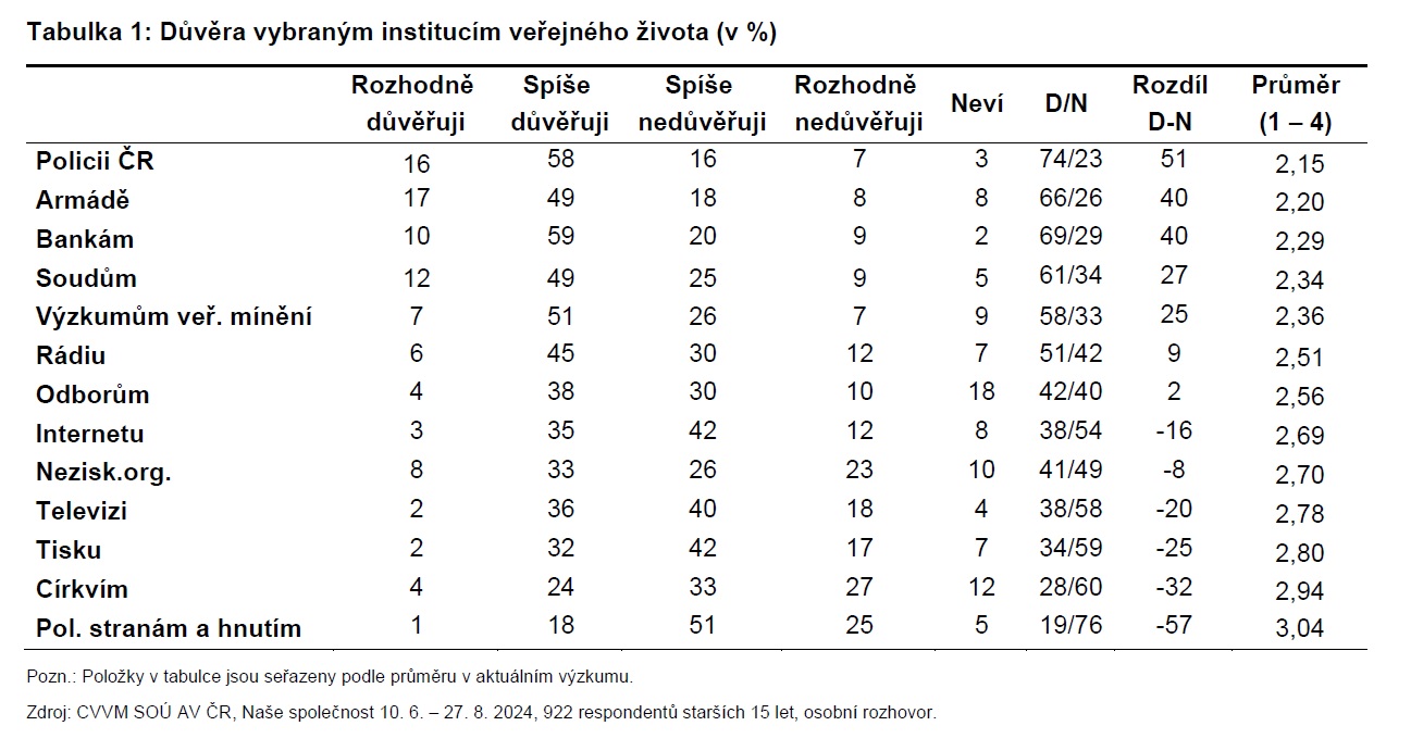 Největší důvěře ze zkoumaných veřejných institucí se těší policie ČR (74 %), banky (69 %) a armáda (66 %), nejméně lidé důvěřují politickým stranám a hnutím (19 %).