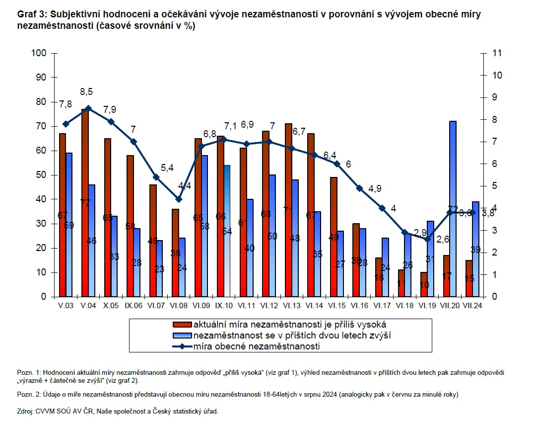 Oproti roku 2020, kdy byla problematika nezaměstnanosti naposled dotazována, se hodnocení nezaměstnanosti změnilo. O 8 procentních bodů vzrostlo hodnocení „příliš nízká“, naopak o 7 bodů se snížilo hodnocení „přiměřená“.