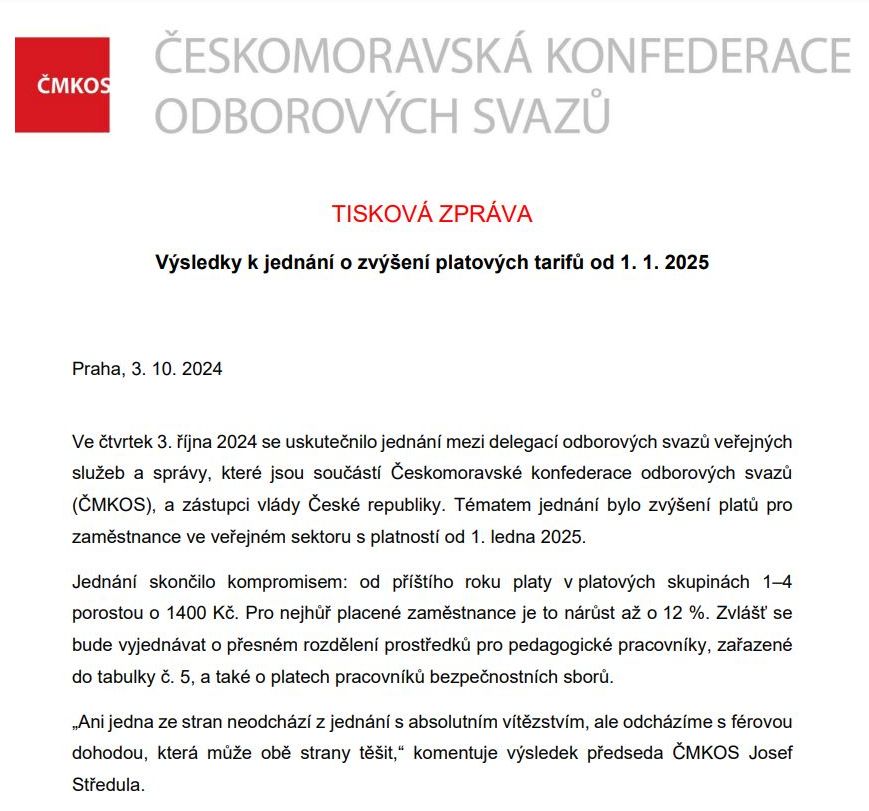 Z PRVNÍ RUKY: Výsledky jednání odborářů s vládou o navyšování platů od 1. 1. 2025 ve veřejné správě a sféře