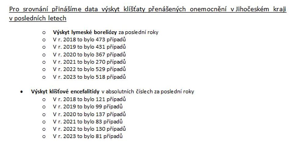 Pro srovnání: V roce 2023 bylo v Jihočeském kraji evidováno za celou sezonu 518 potvrzených případů lymeské boreliózy a 81 potvrzených případů klíšťové encefalitidy. Proti ní existuje efektivní očkování, které je pro pojištěnce nad 50 let věku zdarma.