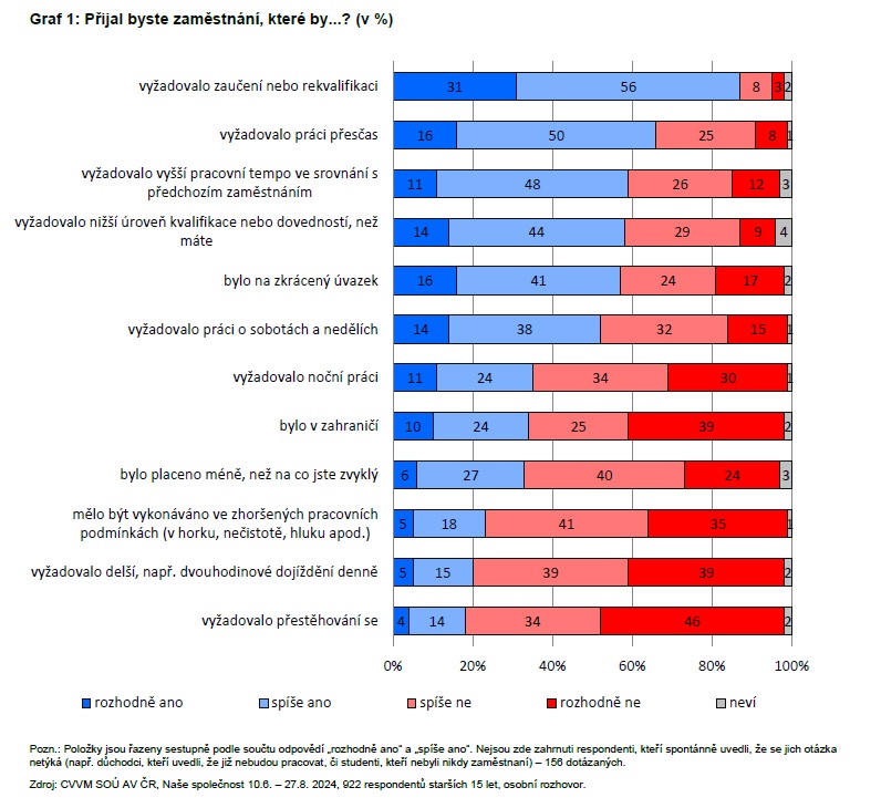 V rámci výzkumu, který proběhl letos v červnu až v srpnu 2024, položilo CVVM respondentům baterii otázek, která zjišťovala, zda by v případě nezaměstnanosti přijali zaměstnání vyžadující jisté ústupky, a dále otázku, jakou práci by dotázaný hledal při ztrátě zaměstnání (konkrétní – jakoukoli).