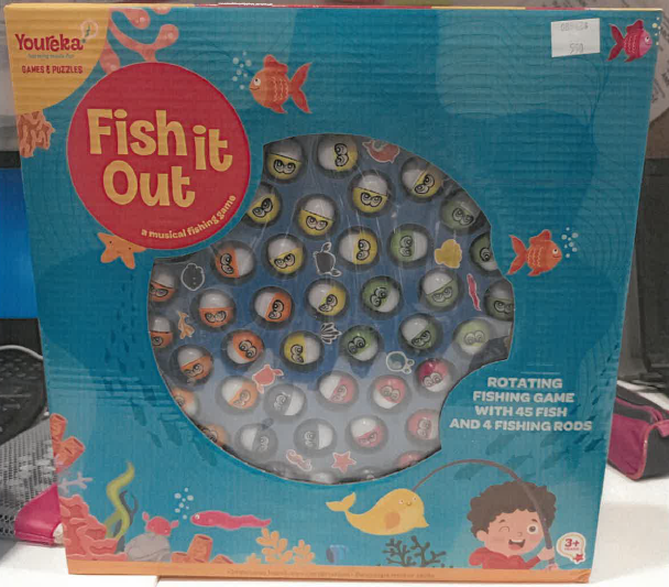 Jedná se o plastovou hru ve tvaru kruhu, který hraje a otáčí se. Uprostřed jsou plastové rybičky, které otevírají pusinku. Pomocí plastových prutů se rybičky chytají. Hračka je na baterie AA 2 x 1,5 V. Obal je tvořen kombinací PVC a kartonu. Na obalu jsou uvedeny informace k použití výrobku.