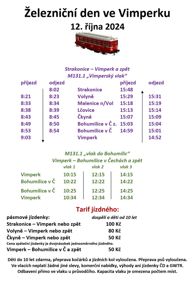 Spolek navíc v rámci zastávky Legiovlaku připravil Železniční den ve Vimperku, který se bude konat v sobotu 12. října od 9 do 16 hodin. Pro návštěvníky budou připravena historická vozidla a technika. A také se budou moci svézt speciálním vlakem s historickým motorovým vozem M131.1 Hurvínek do Strakonic nebo Bohumilic a zpět. Viz ceník a jízdní řád.