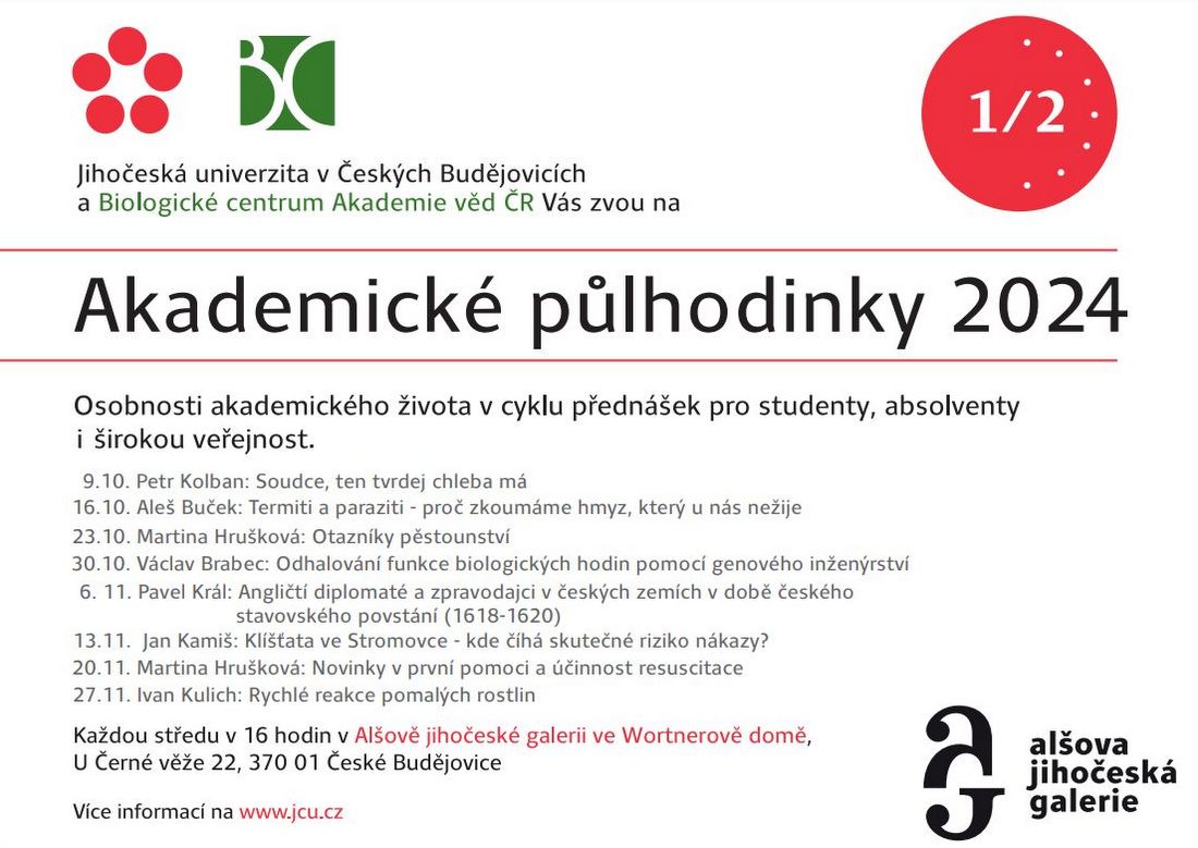 Jak fungují biologické hodiny? Jak se správně provádí první pomoc? Kolik nakažených klíšťat se vyskytuje v českobudějovické Stromovce či jací angličtí diplomaté působili v českých zemích v době českého stavovského povstání? Tato a další témata přináší nový, v pořadí devatenáctý přednáškový cyklus Akademické půlhodinky. Ten společně již jedenáctým rokem připravují Biologické centrum Akademie věd ČR a Jihočeská univerzita v Českých Budějovicích.