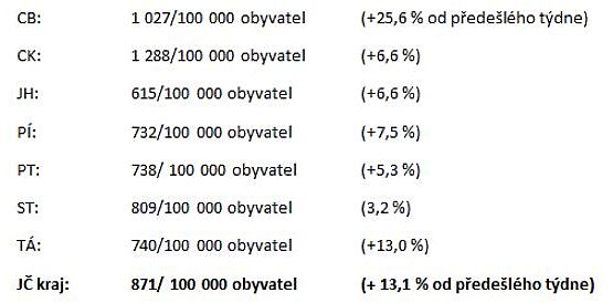 Minulá sezona akutních respiračních infekcí trvala celkem dlouho, ještě v květnu se relativní nemocnost držela kolem tisíce případů na sto tisíc obyvatel Jihočeského kraje. Ve srovnání s předchozím týdnem, kdy bylo 770 případů na sto tisíc obyvatel, nyní nemocnost stoupla v kraji v relativních číslech o více než sto případů na sto tisíc obyvatel. To představuje nárůst o 13,1 procenta a je nyní 871 případů na sto tisíc obyvatel. Nástup sezony akutních respiračních infekcí a chřipek lze očekávat v řádu týdnů, v listopadu se obvykle nemocnost v kraji dostává k hranici tisíce a nad tisíc případů na sto tisíc obyvatel a před vánočními prázdninami dosahuje sezona prvního vrcholu s epidemickými výskyty kolem 1 500 a více případů na sto tisíc obyvatel regionu.