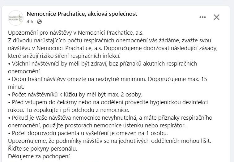 AKTUÁLNĚ: Upozornění pro návštěvníky Nemocnice Prachatice