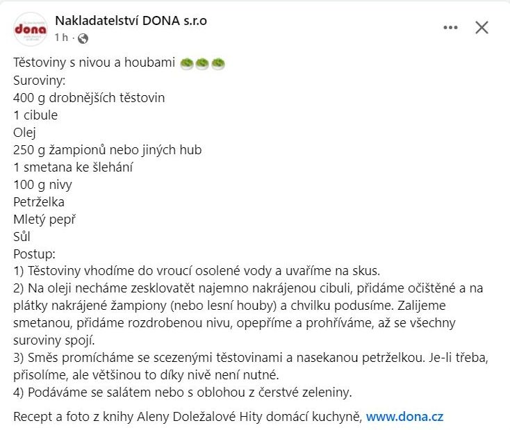 RECEPTY Z KUCHYNĚ: Těstoviny s nivou a houbami