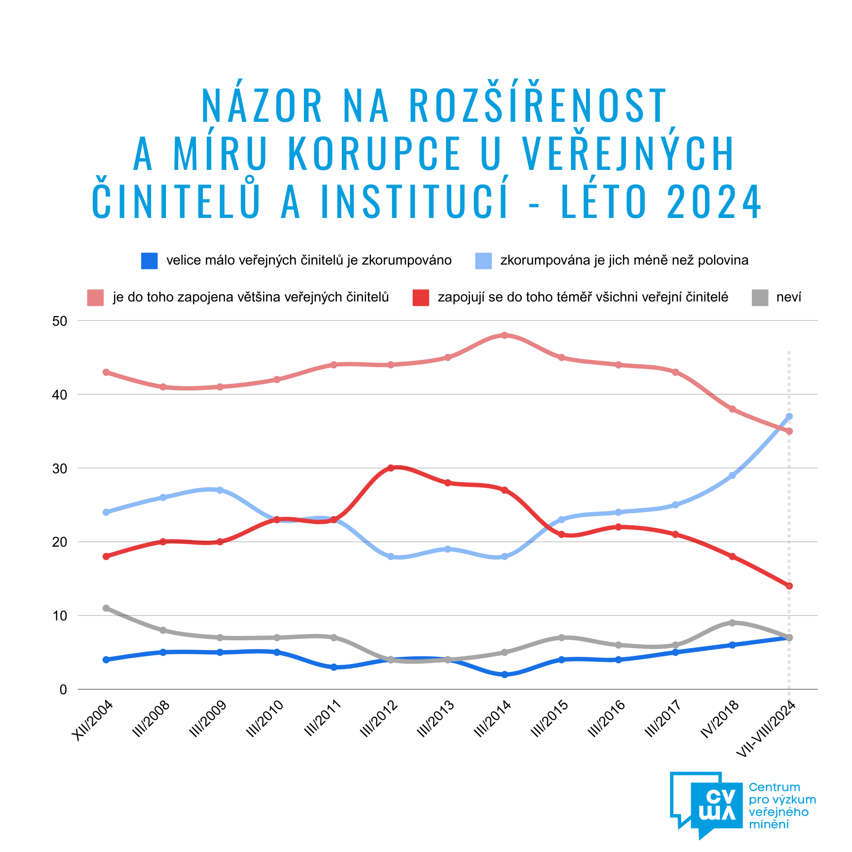 V létě 2024 zařadilo CVVM SOÚ AV ČR, v. v. i. do pravidelného výzkumu Naše společnost sadu otázek týkajících se korupce. Občané vyjadřovali svůj názor na rozšíření korupce v České republice a zároveň hodnotili míru korupce u vybraných institucí a oblastí veřejného života.