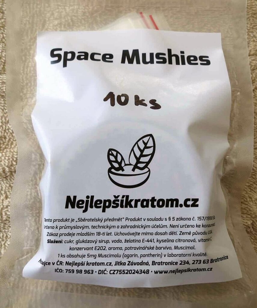 Jedná se o produkt Space Mushies, balení o obsahu 10 kusů želatinových bonbonů, bez označení šarže / data použitelnosti (DP) / data minimální trvanlivosti (DMT). Vzorek byl odebrán kontrolním nákupem z webových stránek https://www.nejlepsikratom.cz, jejichž provozovatelem je JITKA ZÁVODNÁ, 273 63 Bratronice 234. Laboratorní rozbor v produktu potvrdil obsah muscimolu v množství 757 miligramů na kilogram (mg/kg).