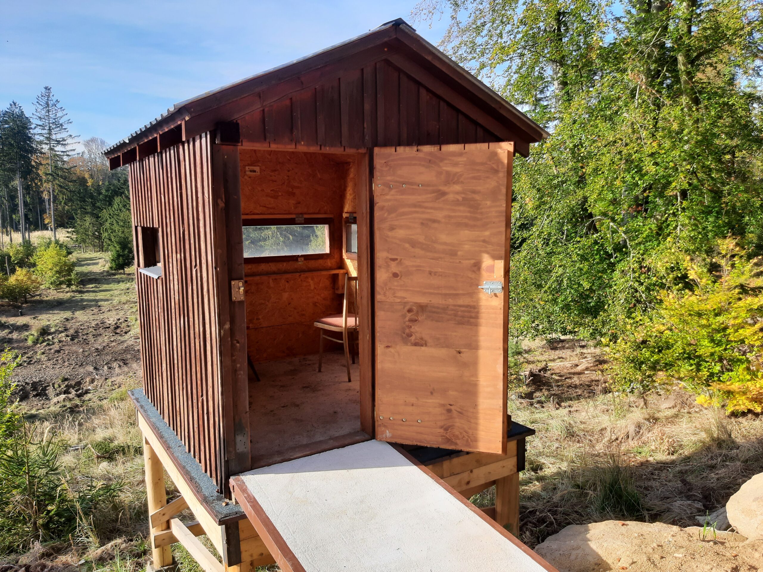 Zvažovala se různá technická řešení. „Nakonec nás při pochůzce oborou napadlo využít prudký svah, na jehož vrcholu vede lesní cesta. Těsně pod ní jsme vybudovali plošinu s kazatelnou a nájezdy pro vozík. Je tam odtud překrásný výhled na mladé dubové lesy založené po orkánu Kyrill,“ uvádí oborník ze Sedlic Jindřich Brožovský. V tamější oboře spravované Lesní správou Vodňany je i druhý bezbariérový posed. Vznikl ze starého nevyužívaného skladu přístupného ze stávající lesní cesty. „Sami jsme ho přebudovali a instalovali nájezdy a kamna,“ zmínil oborník, který se stará o chov černé a dančí zvěře i jelenů Sika Dybowského.
