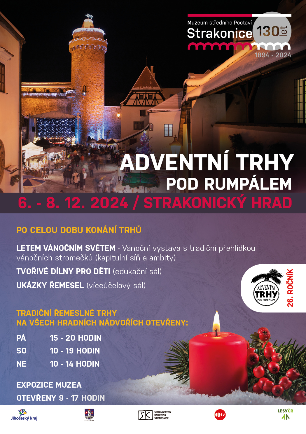 Také máte rádi tu pravou předvánoční atmosféru svátečního očekávání? Muzeum středního Pootaví vás zve na vyhlášené adventní trhy na strakonickém hradě! Tradičně druhý adventní víkend, 6. – 8. prosince! Přijďte se projít mezi stánky a vyberte něco hezkého sobě nebo svým blízkým.