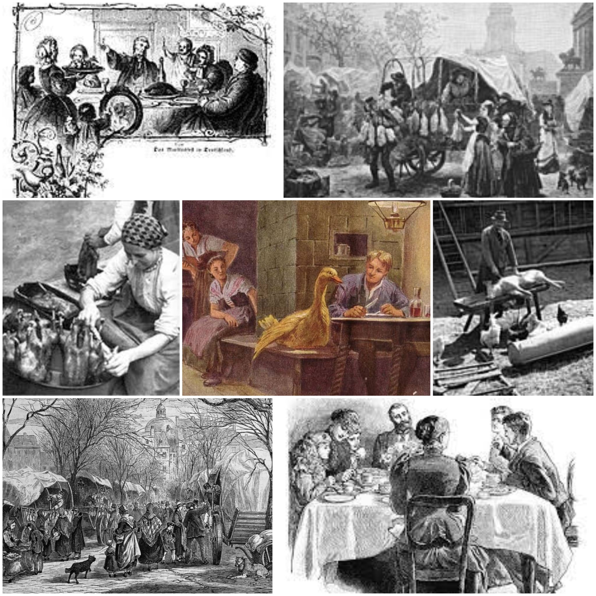milý hospodář a jeho družina husy jedí, víno k tomu pijíce