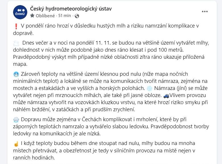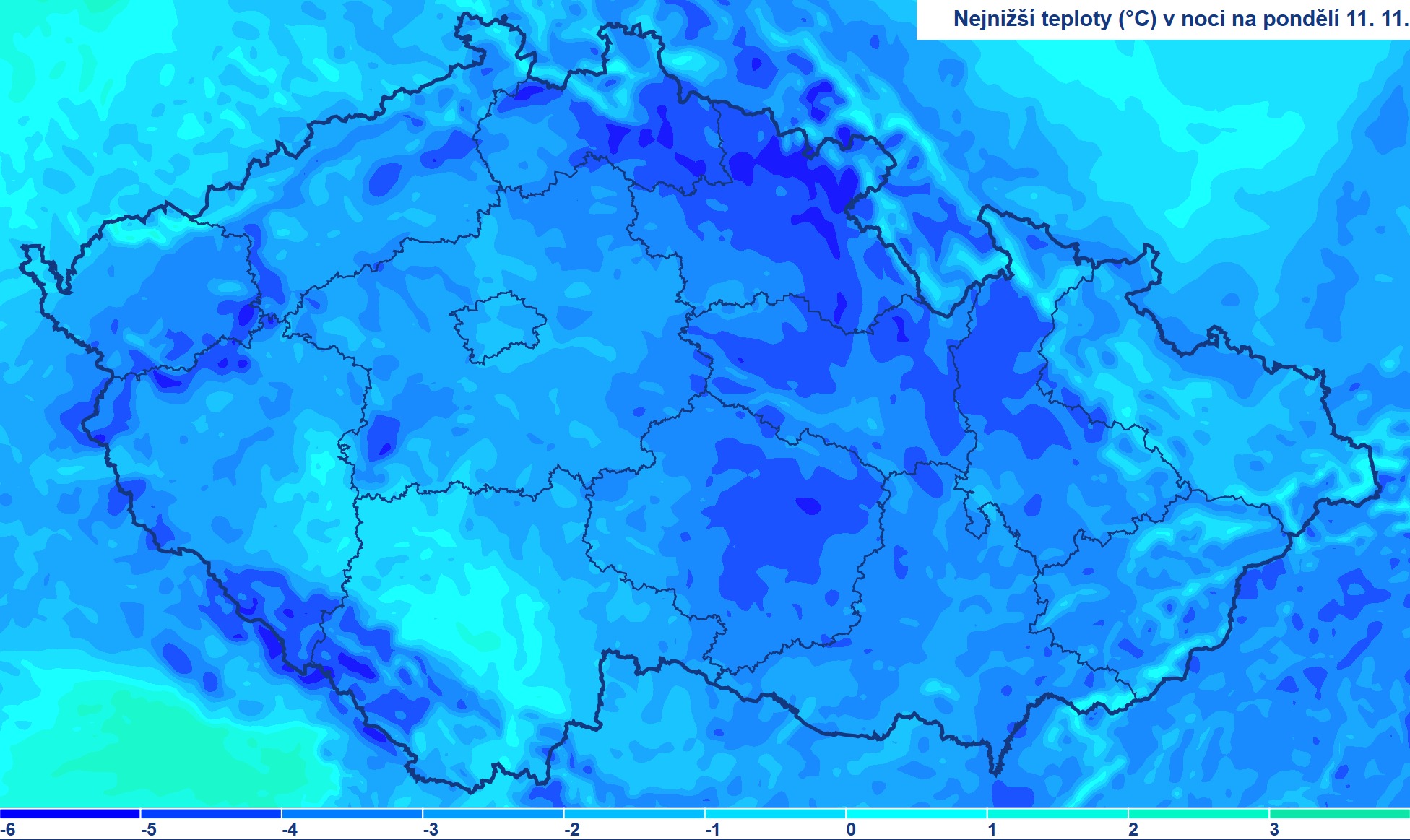 Počasí – sobota 9. 11. – Víkend přinese mrazivé noci. Teploty budou při jasné obloze klesat k -5 °C