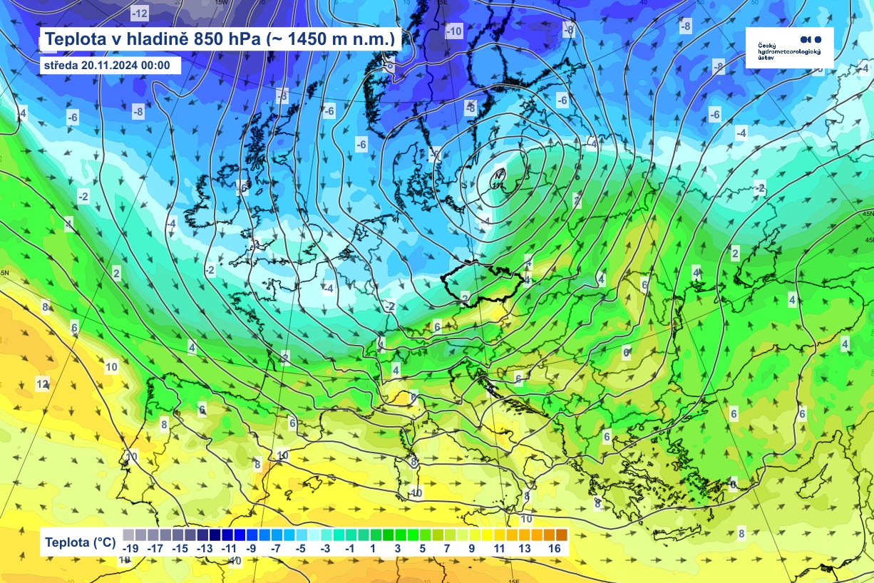 Ochlazení to bude poměrně razantní, i když na Moravě a ve Slezsku se projeví později než v Čechách až během rána a dopoledne. Situaci charakterizuje i mapka teploty v hladině 850 hPa (kolem 1450 m n.m.) po zítřejší půlnoci.
