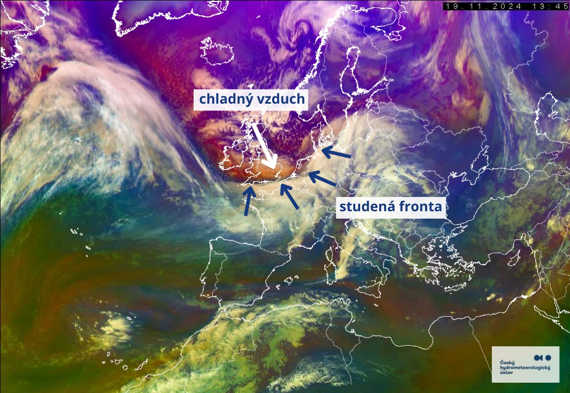 I když aktuální teploty se v nížinách pohybují i kolem 10 °C, na obzoru už je výrazná změna v charakteru počasí. Během noci nás velmi rychle přejde studená fronta, za kterou k nám pronikne chladný vzduch. Ta se aktuálně nachází v oblasti Beneluxu a Německa (níže snímek z družice MSG).