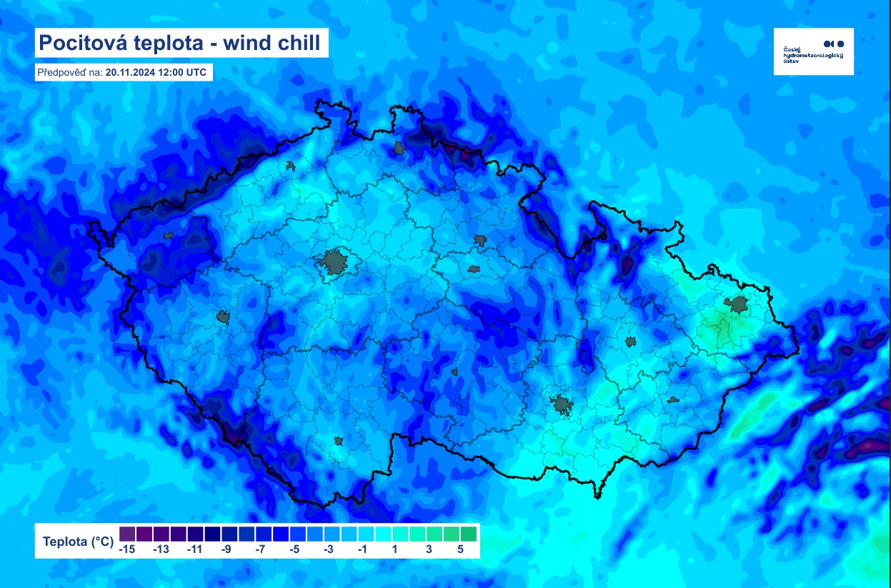 Při přechodu fronty během noci očekáváme nejvýraznější nárazy větru, za frontou se bude vítr uklidňovat. Pocitová teplota nicméně bude zítra zejména v Čechách nízká a i když na teploměru naměříme většinou kolem +3 °C, pocitově bude kolem 0 °C, na horách i výrazně méně. Mapka pocitové teploty pro zítřejší den je níže.