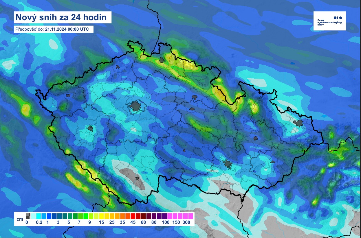 Celkové úhrny nového sněhu od následující do čtvrteční půlnoci naleznete níže.