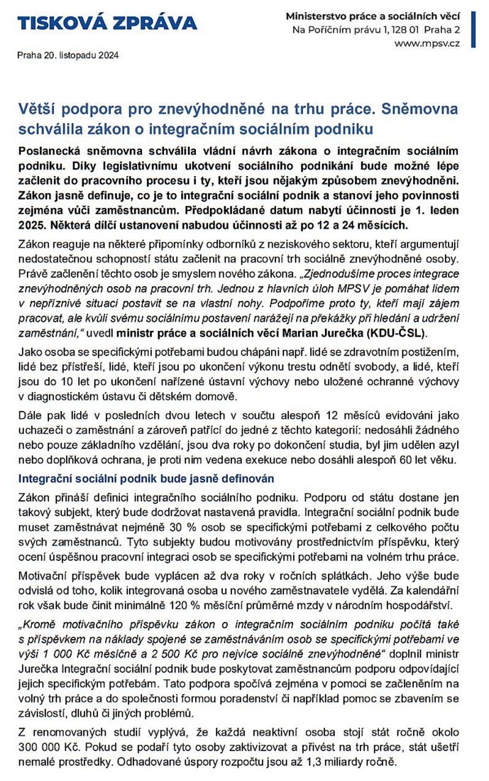 AKTUÁLNĚ: Větší podpora pro znevýhodněné na trhu práce. Sněmovna schválila zákon o integračním sociálním podniku