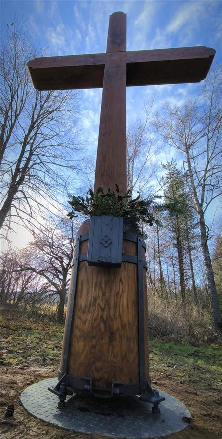 Předcházelo tomu také vyčištění nynějšího paloučku od plevele a náletových dřevin a nové zaměření pozemku, který je ve vlastnictví města. Kříž vyrobil tesař a řezbář Libor Kuzďas z Veselky pod Boubínem, ozdobné kování zhotovil a na osazení kříže se podílel Radek Mařík z Husince.