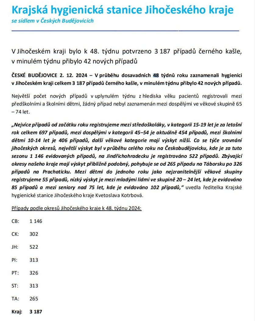 AKTUÁLNĚ: V Jihočeském kraji bylo k 48. týdnu potvrzeno 3 187 případů černého kašle, v minulém týdnu přibylo 42 nových případů