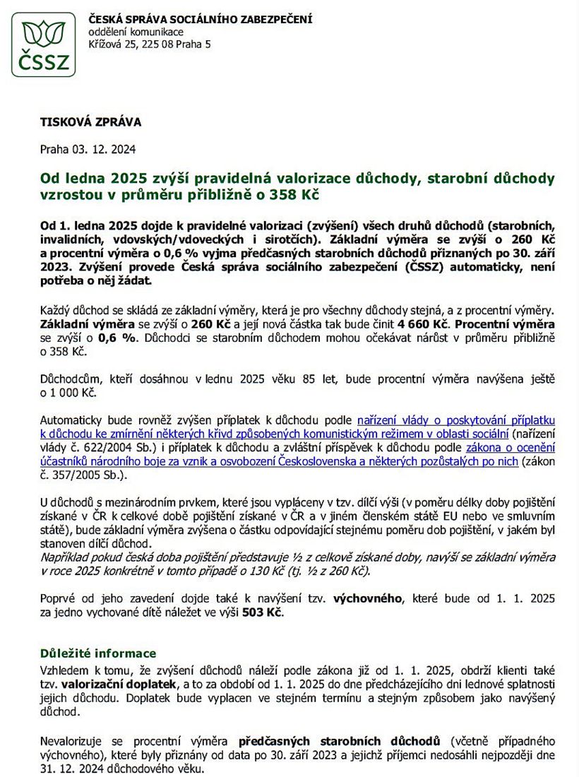 ČESKÁ SPRÁVA SOCIÁLNÍHO ZABEZPEČENÍ: Od ledna 2025 zvýší pravidelná valorizace důchody, starobní důchody vzrostou v průměru přibližně o 358 Kč