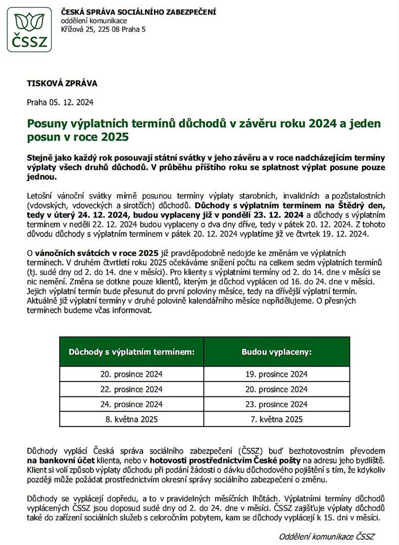 AKTUÁLNĚ: Posuny výplatních termínů důchodů v závěru roku 2024 a jeden posun v roce 2025