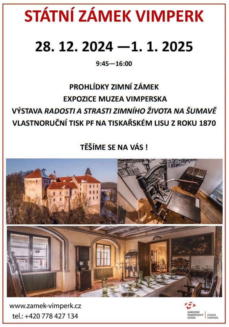 V období mezi vánočními svátky a Novým rokem čeká návštěvníky zámku Vimperk bohatý program. Kromě prohlídkového okruhu Zimní zámek a expozic Muzea Vimperska je připravena nová výstava o zimním životě na Šumavě před padesáti a více lety očima hajného Waltra Palečka a jeho rodiny. Příběh šumavského lesníka pomohou vyprávět předměty denní potřeby včetně vybavení domácnosti či vlastnoručně pleteného oblečení.