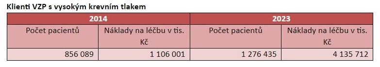 Počet klientů VZP s diagnózou vysokého krevního tlaku v posledních deseti letech výrazně vzrostl. Zatímco v roce 2014 lékaři vykázali hypertenzi u 856 tisíc pacientů, loni se jejich počet zvýšil na 1,3 milionu. Počet léčených pacientů v průběhu deseti let tak vzrostl o 50 %. Růst počtu pacientů s touto diagnózou je podle odborníků alarmující.