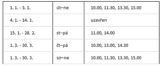 Otevírací doba (časy prohlídek) SZ Třeboň v lednu až březnu:
