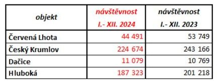 V roce 2024 zamířilo na jihočeské památky téměř 750 tisíc návštěvníků (749 772 osob). Mimořádný zájem byl o zimní a adventní prohlídky. V prosinci 2024 vybrané památky přivítaly více než 27 tisíc turistů, což je téměř o 6 tisíc lidí více než v předchozím roce.