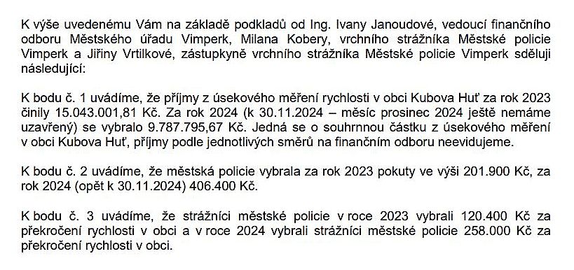 - sdělení, jaká byla celková výše vybraných finančních prostředky na pokutách uložených na základě radarového měření rychlosti prováděného zařízením umístěným na silnici I. třídy č. 4 v obci Kubova Huť, poblíž parkoviště č. p. 10, směr Strážný, a to za roky 2023 a 2024 odděleně;